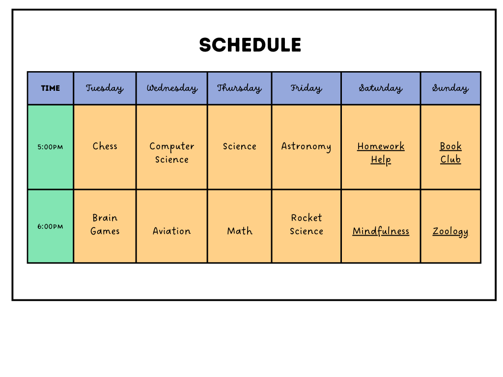 *Underlined courses are DONATION-BASED (pay as much as you feel comfortable) to make them accessible to all children, despite their financial background. Other courses are $20 each class for every student attending. For individual tutoring, read more at the bottom of this page.*